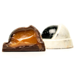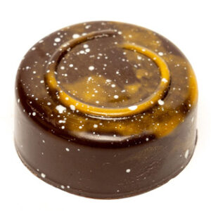 Chocolate al 60% de cacao con caramelo salado con almendra.