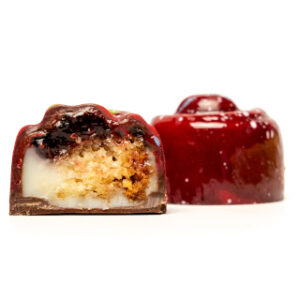 Chocolate blanco con ganache de mora silvestre sin azúcar.