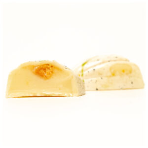 Chocolate blanco con ganache de limón y trozos de galleta de vainilla.