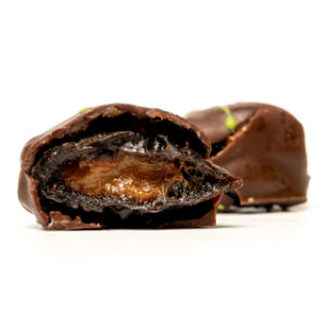 Ciruela rellena de arequipe bañada en chocolate al 60% de cacao.