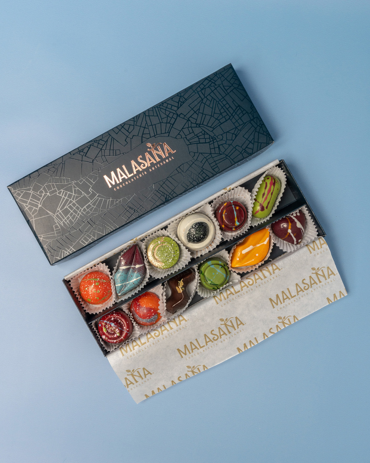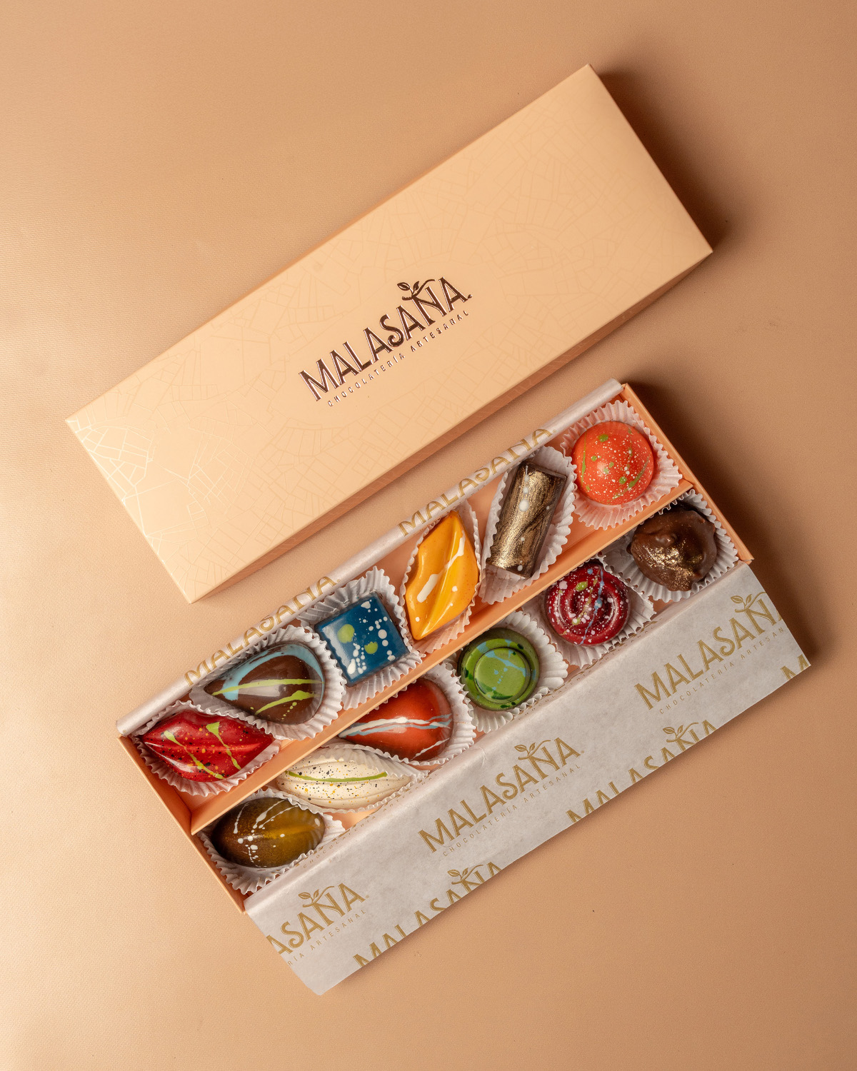 Caja de 12 bombones elaborados a mano uno a uno, incluye bolsa de regalo y tarjeta.