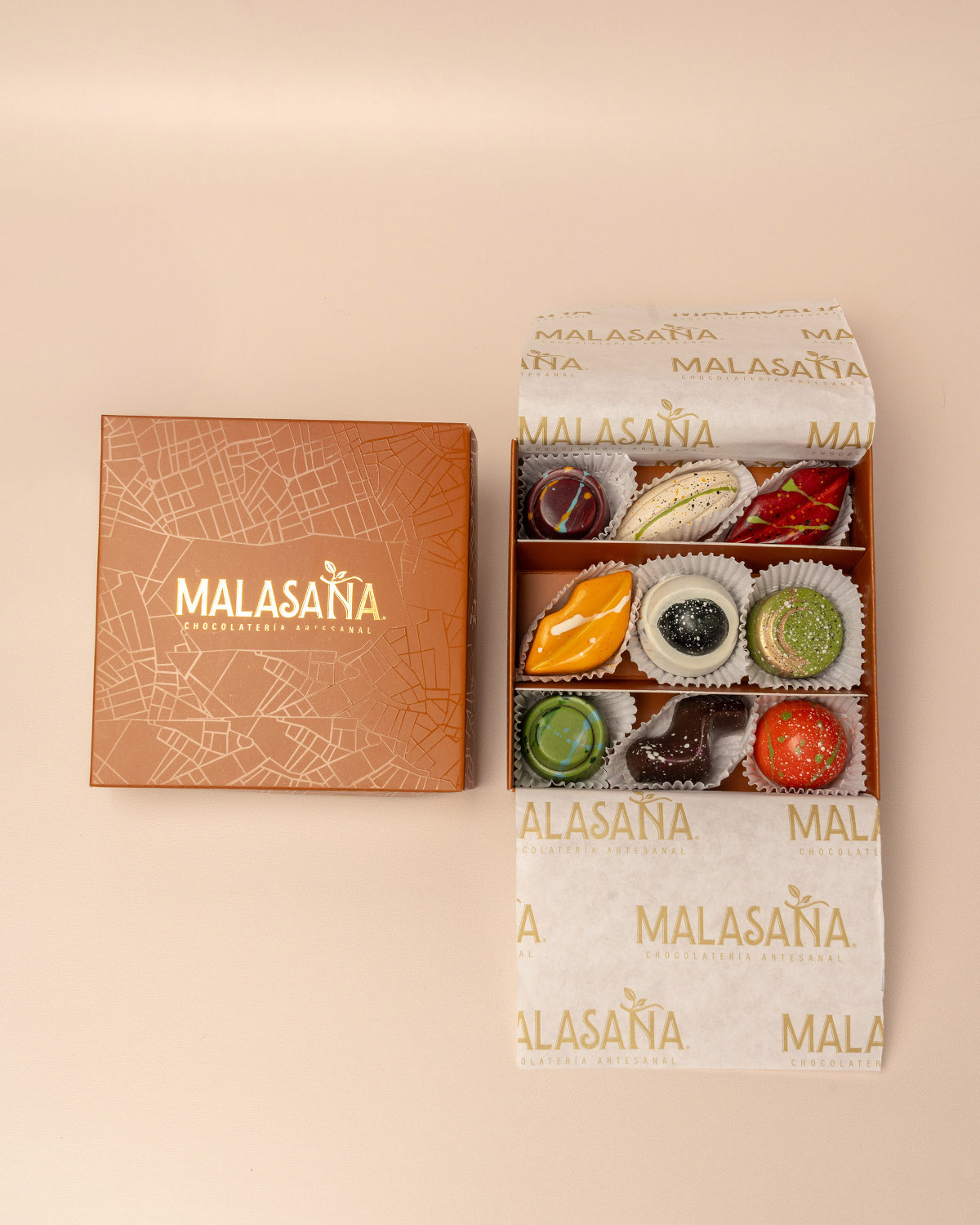 Caja de 9 bombones elaborados a mano uno a uno, incluye bolsa de regalo y tarjeta.