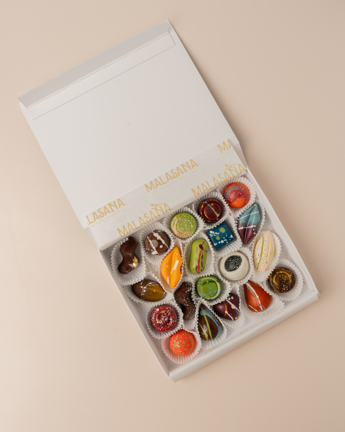Caja de 20 bombones elaborados a mano uno a uno, un bombón de cada sabor, incluye bolsa de regalo y tarjeta.