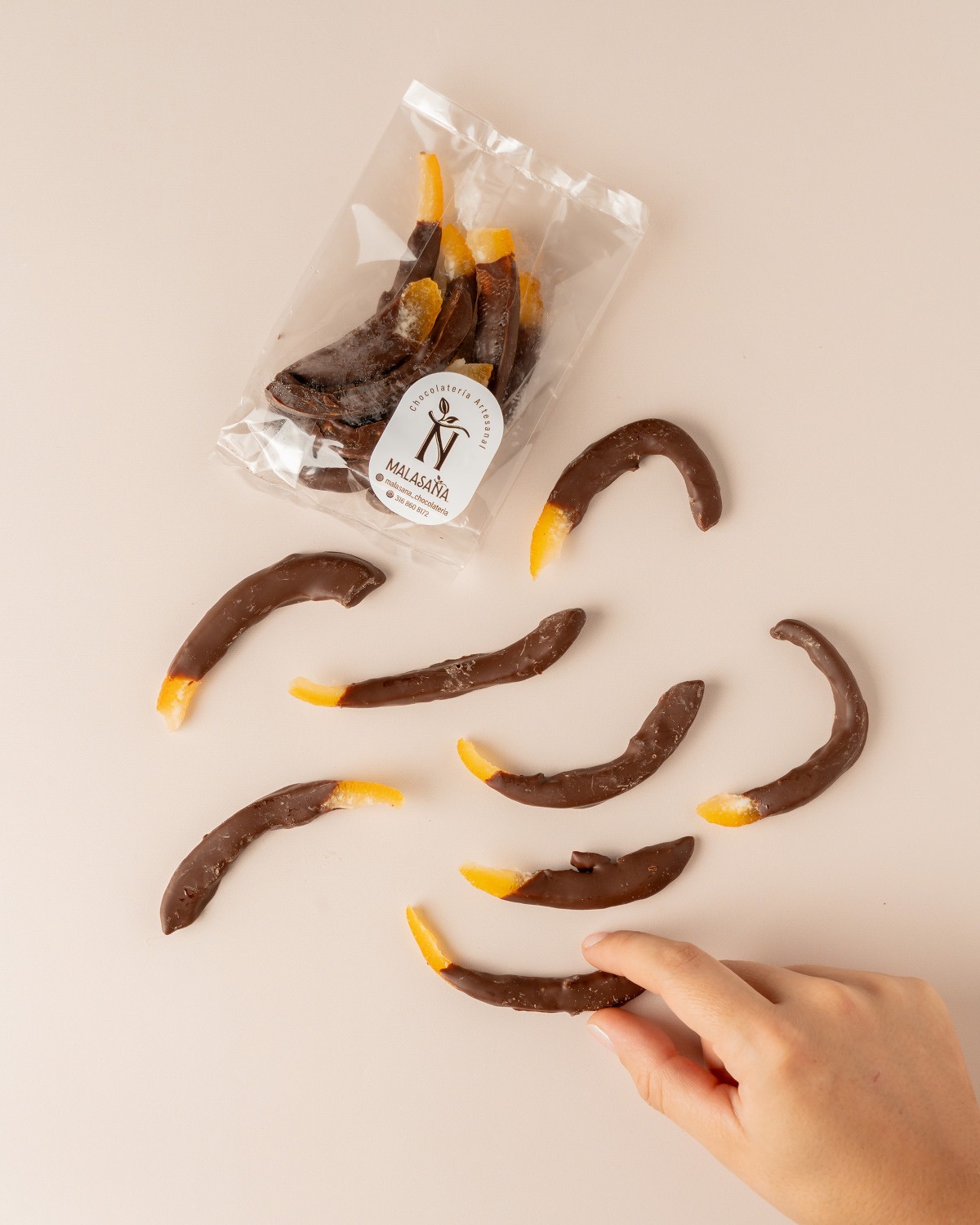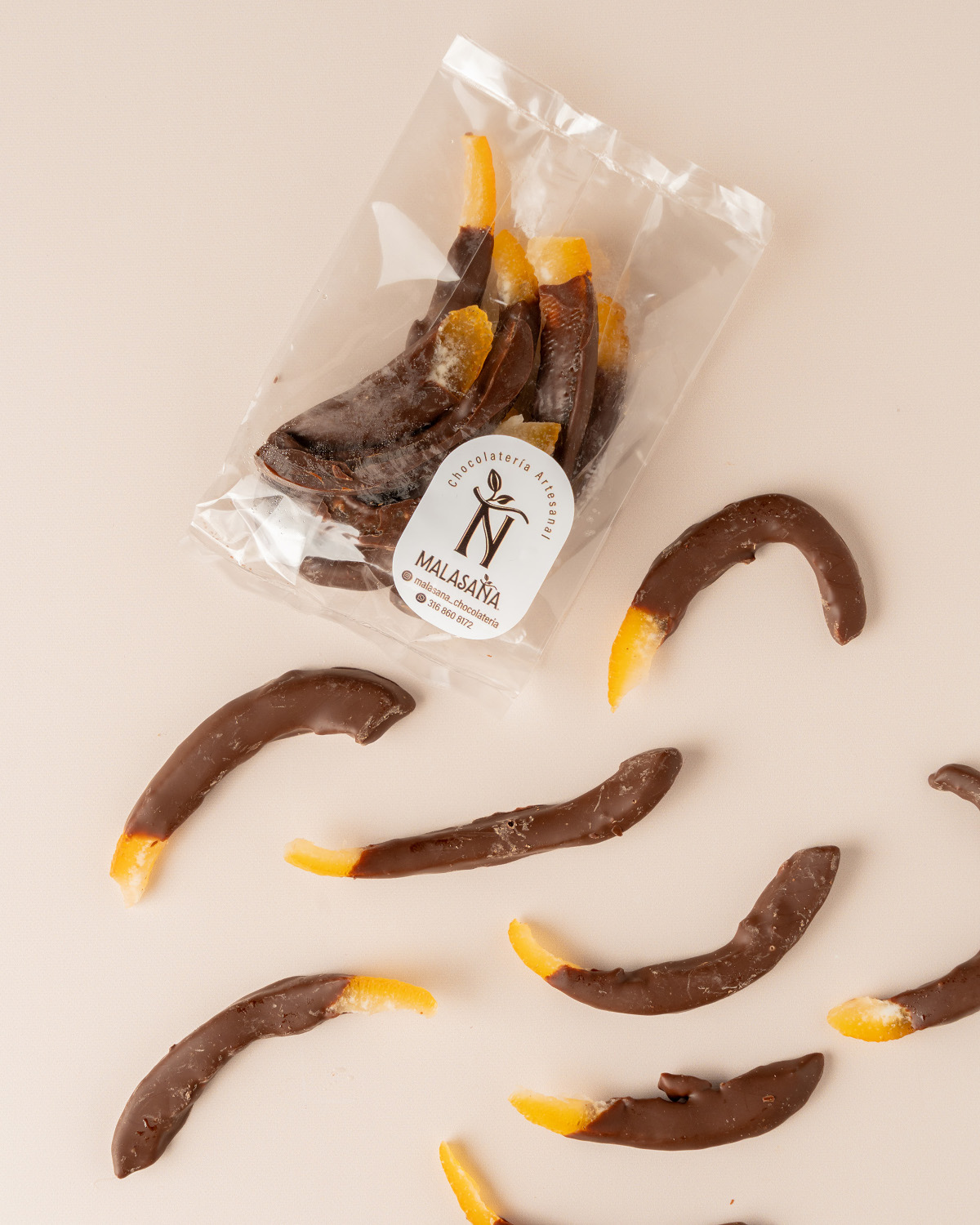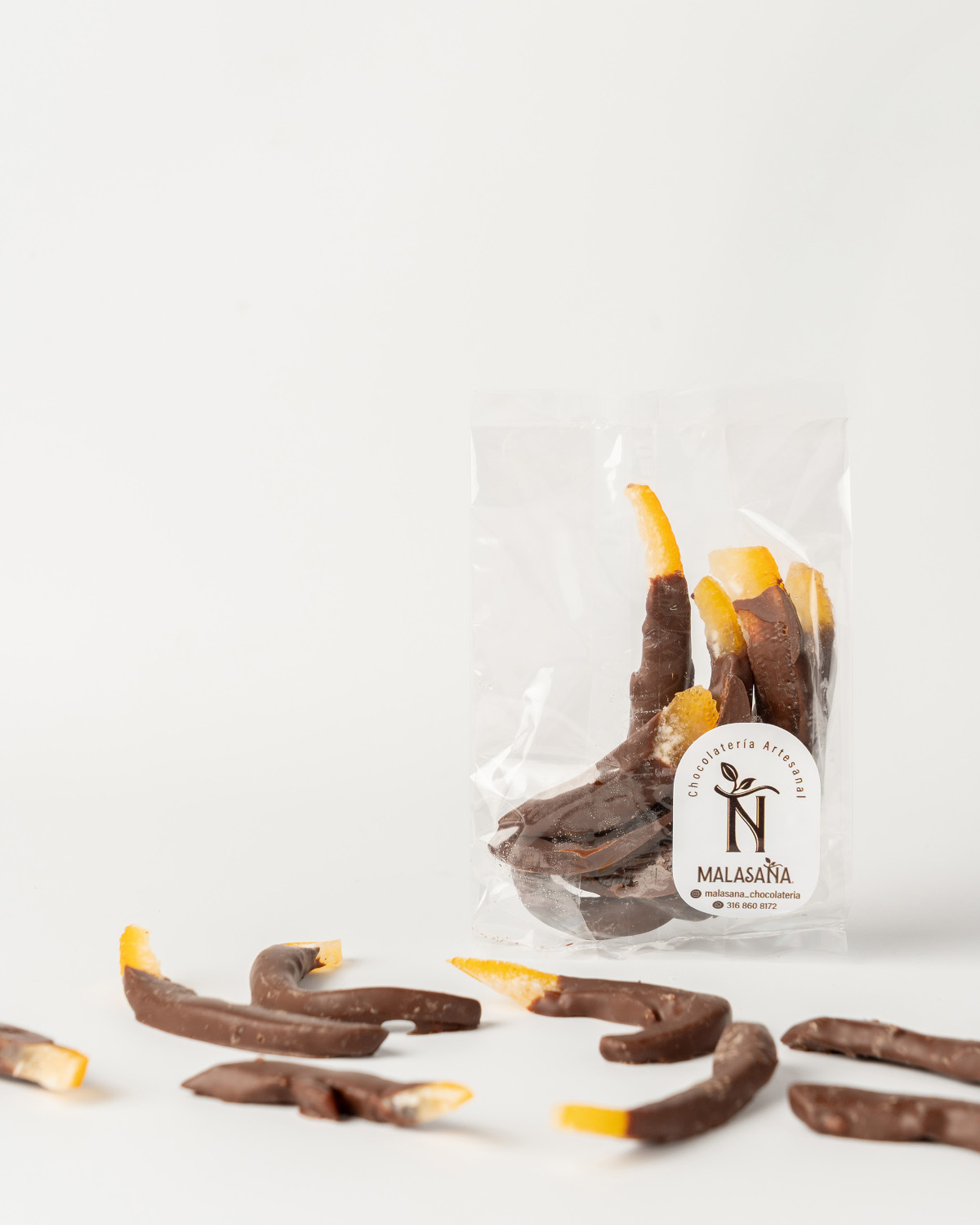 Ricas cáscaras de naranjas confitadas bañadas en chocolate semi amargo, contenido de 62 gramos.